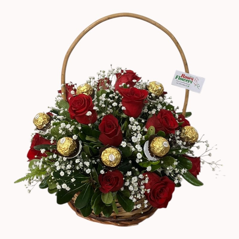 Canasta de 18 rosas rojas, 16 chocolate Ferrero Rocher, follaje y Babi Breath