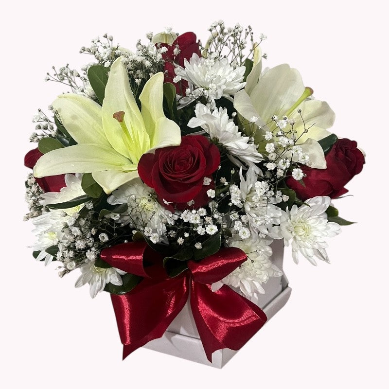 Cajita de 4 rosas rojas, margaritas, Lilies, baby breath y Follaje