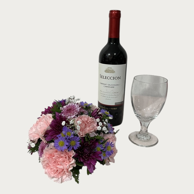 Combo de un centro de mesa de flores varias, 1 Botella de Vino y una copa de cristal
