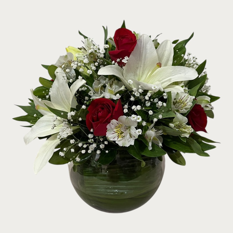 Arreglo Floral de 6 rosas rojas, Lilies blancas, Alstroemeria, Babi breath y follaje