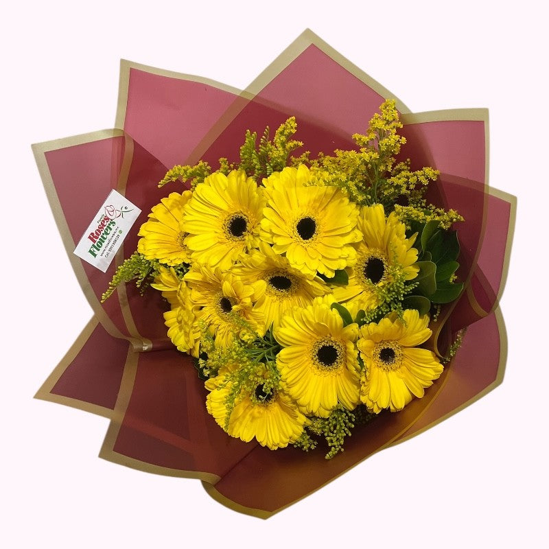 Bouquet de 10 gerberas amarillas, flor pequeña y follaje