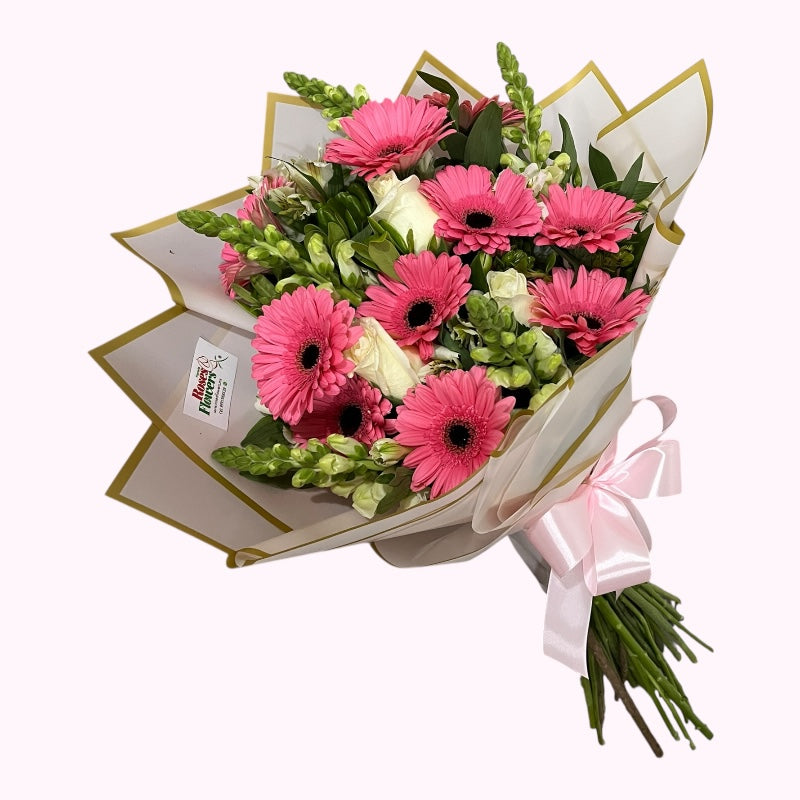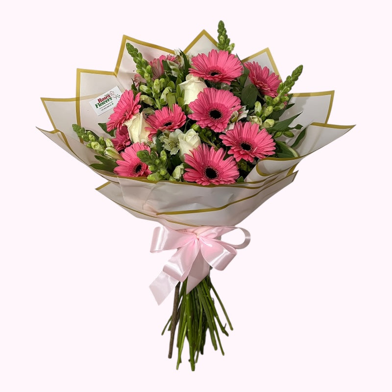 Bouquet de 10 gerberas color rosa, 3 rosas blancas, perritos blancos de invernadero y follaje.