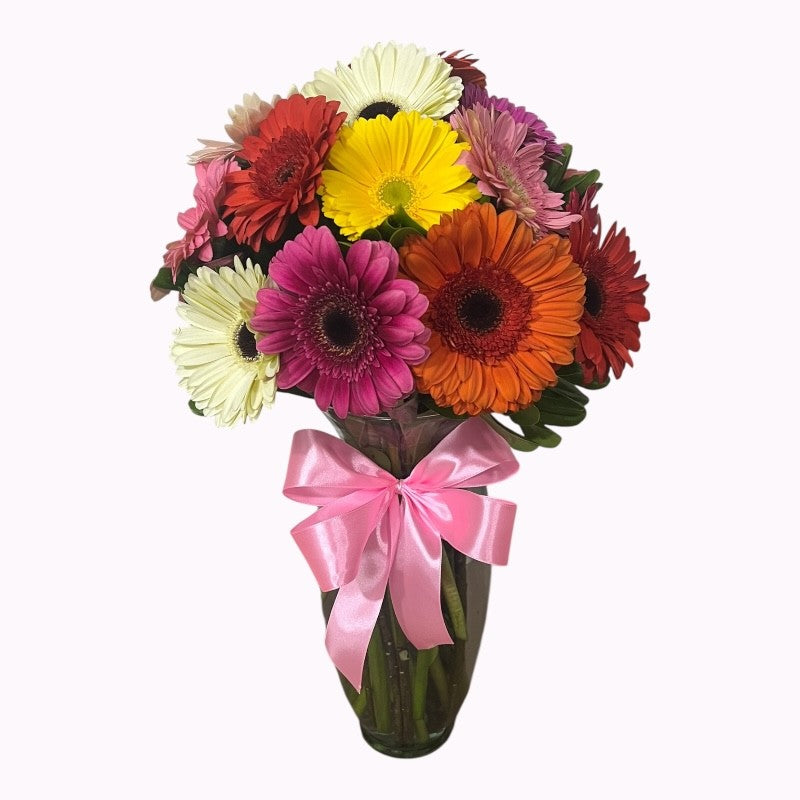 Florero de con 20 Gerberas de colores y follaje.