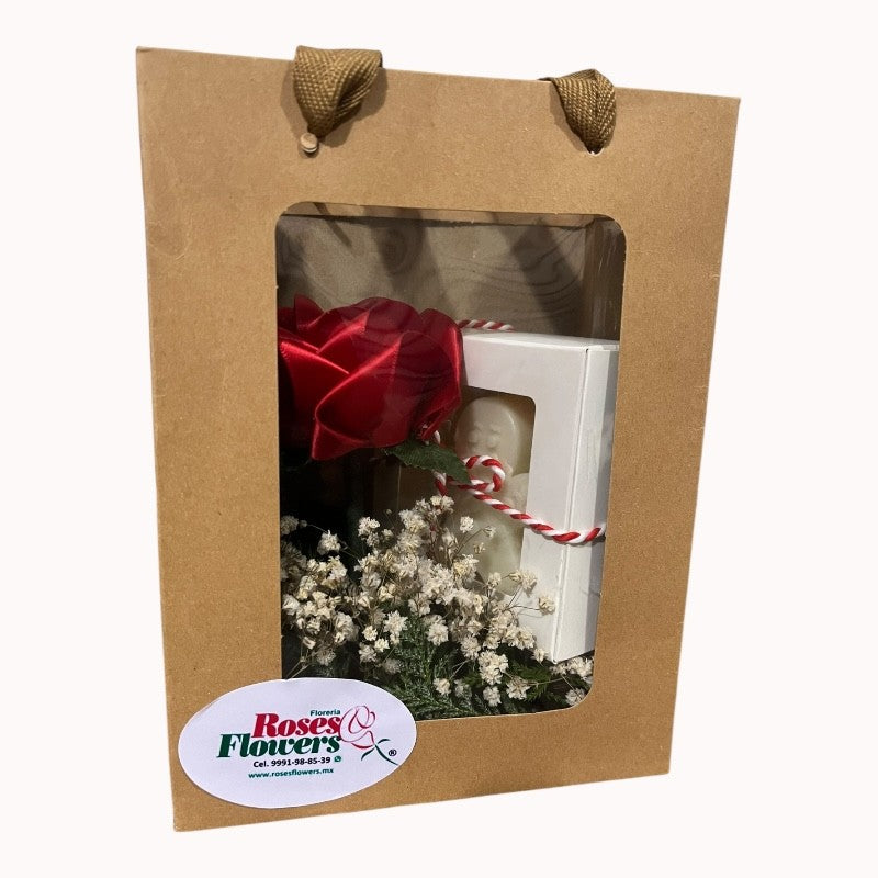 Regalo con una Rosa roja hecha de Listón, una Vela aromática de Jengibre, y flor blanca.