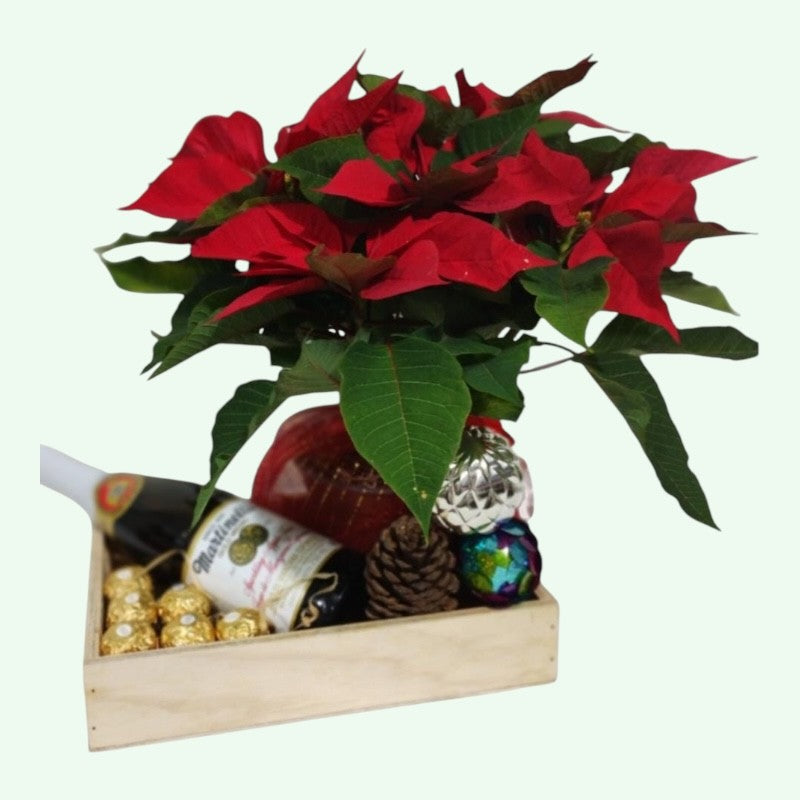 Maceta de nochebuena, 1 botella Martinelli de Jugo de sidra de manzana espumoso sin alcohol, chocolates Ferrero Rocher y unos adornos navideños en cajita de madera