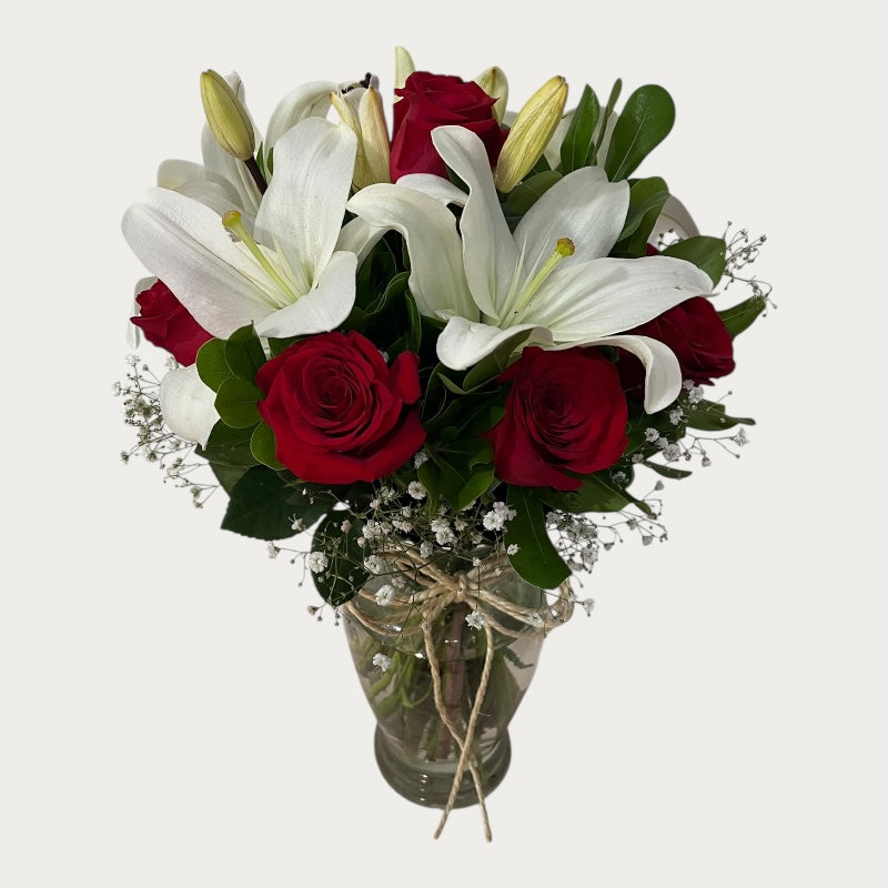 Florero con 6 rosas rojas, Lilies blancas y babi breath