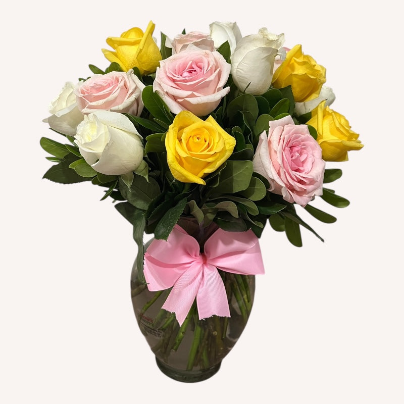 Florero de cristal con 8 rosas rosas, 8 rosas blancas y 8 rosas amarillas