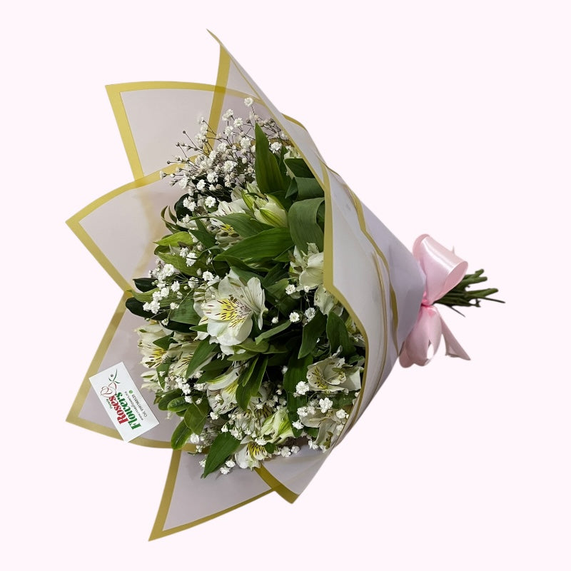 Bouquet de alstroemerias blancas, Baby Breath y decorado.